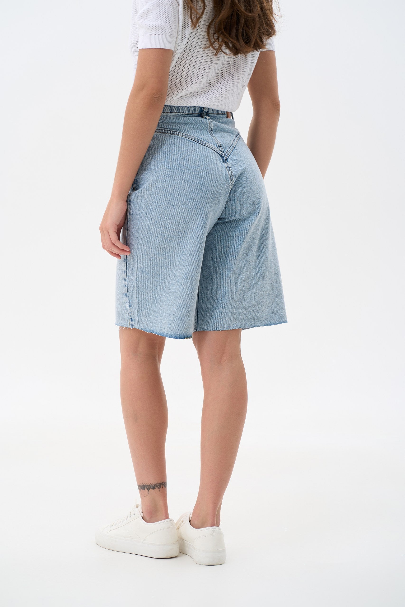 Blue shorts with a figured yoke are a stylish and spectacular element of the summer wardrobe, which attracts attention with their design and bright color. These shorts are made of light blue fabric, which is ideal for summer days. They have a high rise and a figured yoke, which adds femininity and sophistication to them. Blue shorts with a figured yoke go perfectly with tops, T-shirts, blouses and shirts. They can be worn both for a casual look and for a more formal look. In addition, they can be combined with leather bags, flat shoes and accessories to create more complete looks.