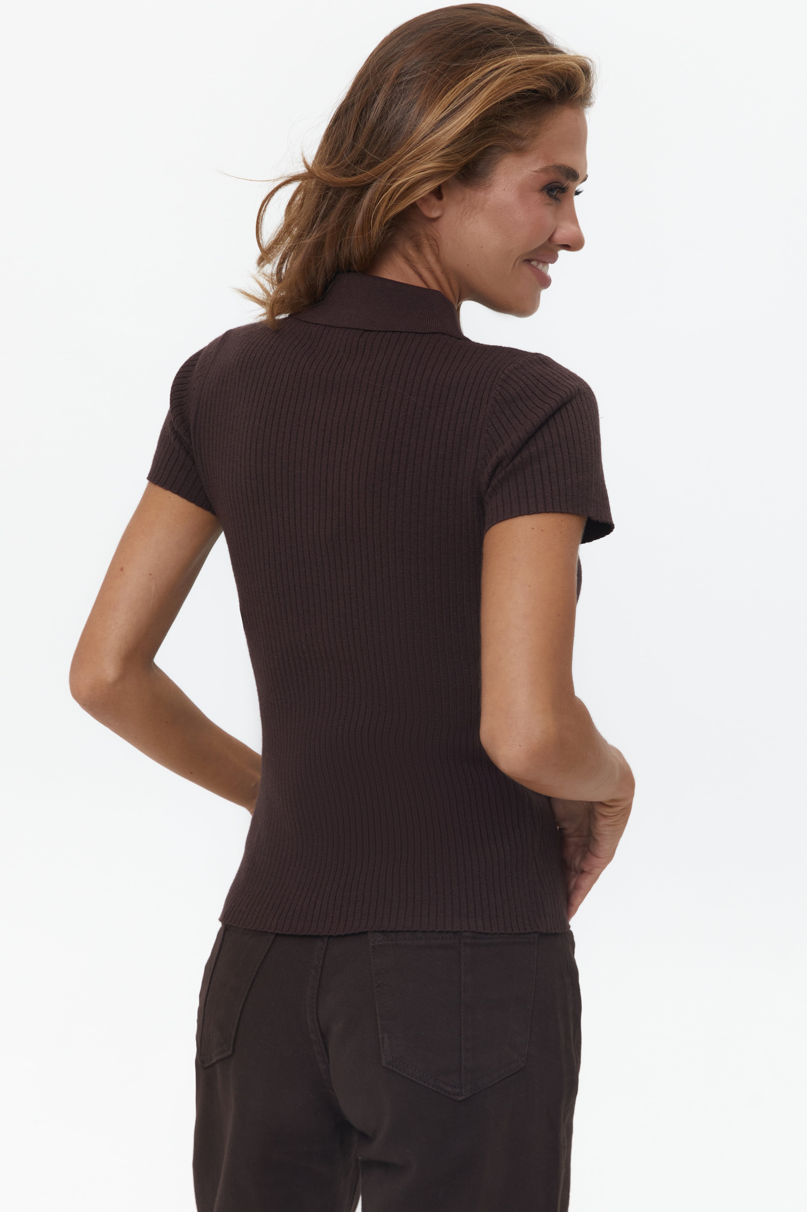 A plain knit polo shirt with fine ribbed texture is a versatile staple that blends comfort with understated elegance. The cotton-based fabric, enriched with viscose and elastane, feels soft and fits comfortably. The classic polo collar adds a subtle nod to old money style. Pair it with jeans and sneakers for a casual everyday look, or with Bermuda shorts and loafers for a light summer outfit. For a more polished option, style it with a pleated skirt and sandals.