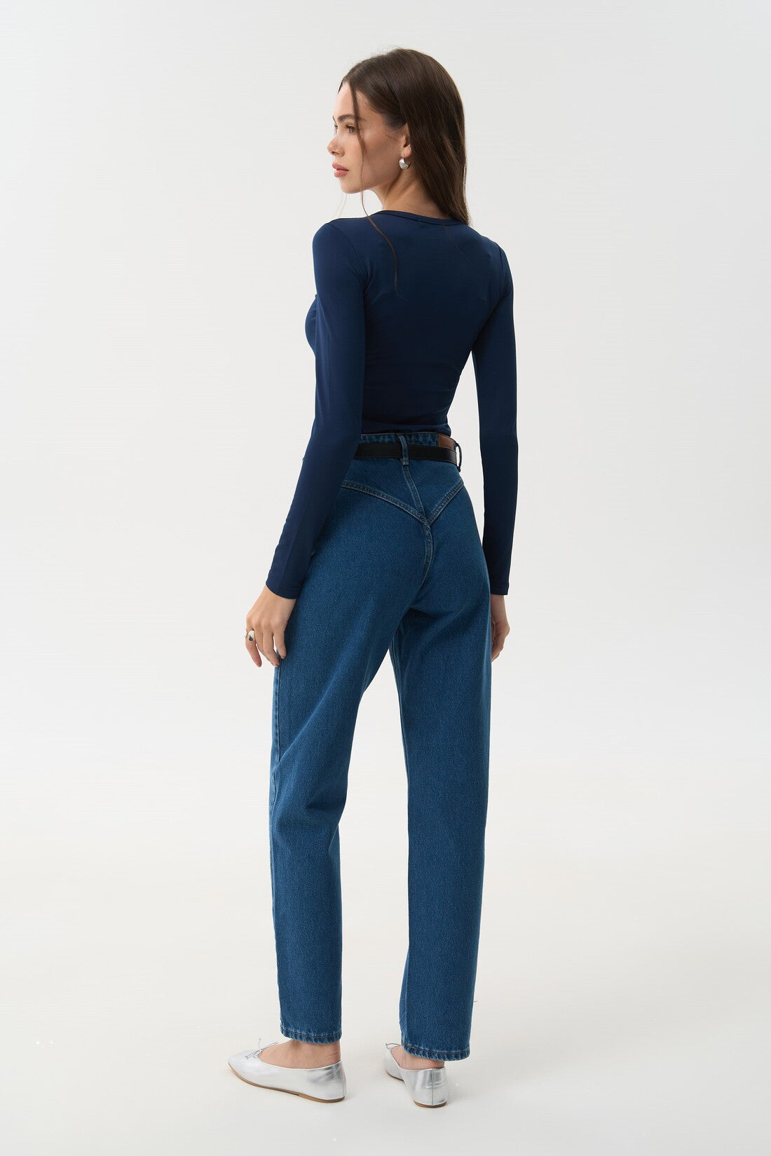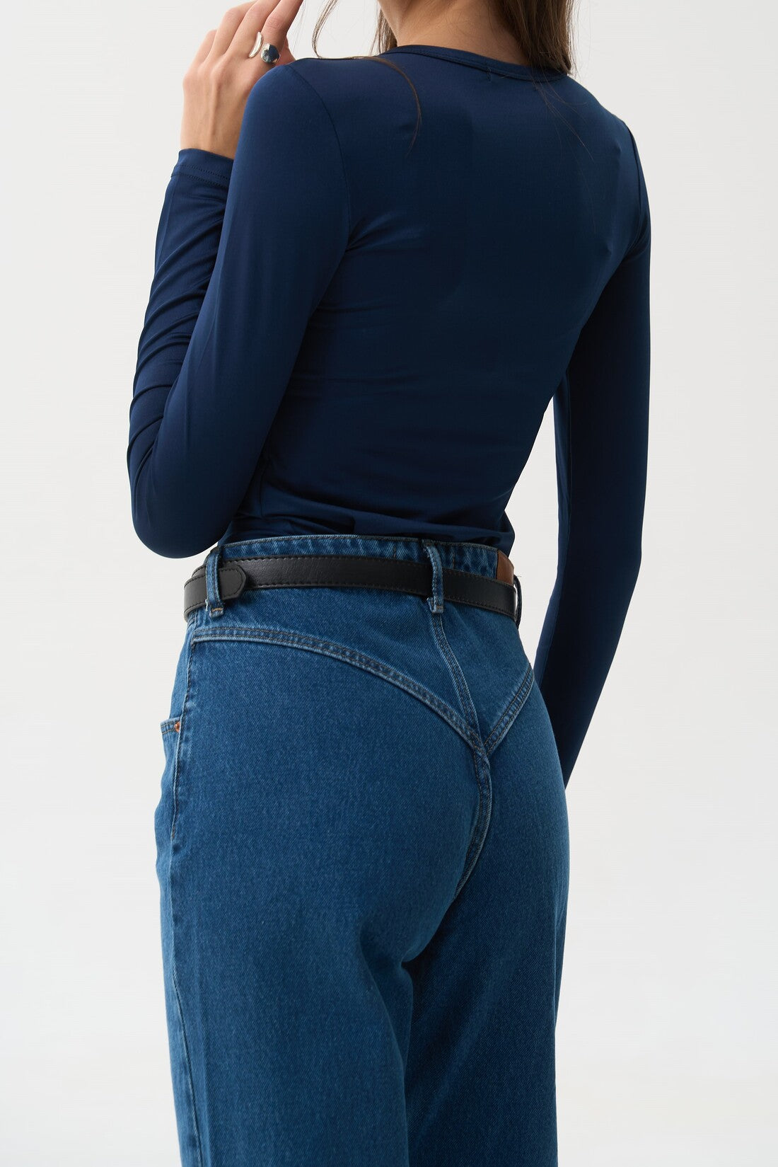 Bright blue straight-leg jeans made from high-quality, dense cotton. Featuring a classic straight silhouette and contoured yoke details that accentuate the hips, these jeans with a high rise serve as a versatile base for any style, from casual to retro. They pair well with both tailored and oversized tops. The fabric is thick yet comfortable, made entirely from natural cotton, ensuring that outfits with these jeans are both stylish and comfortable.